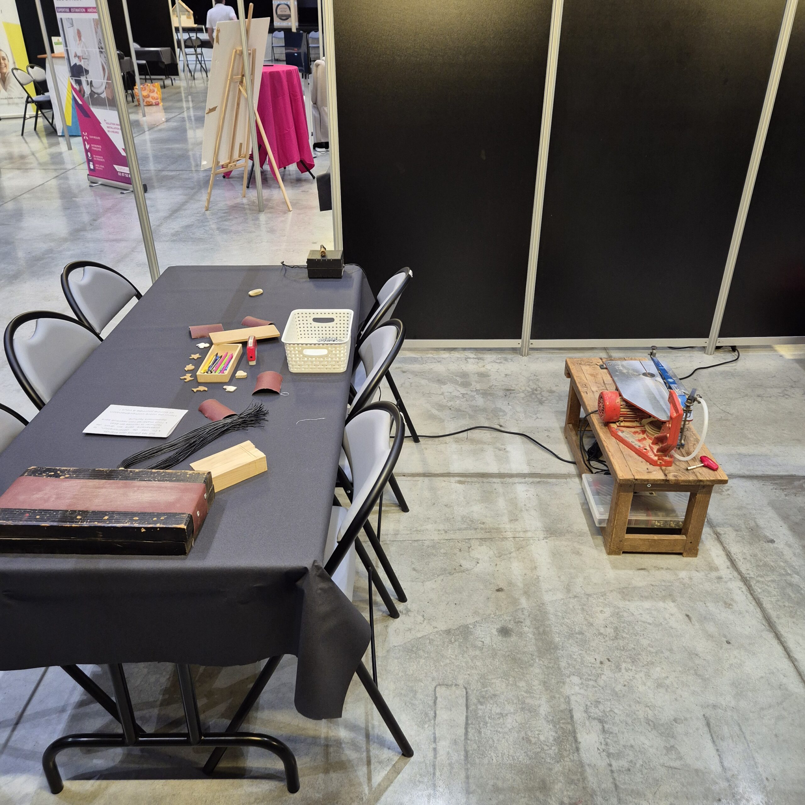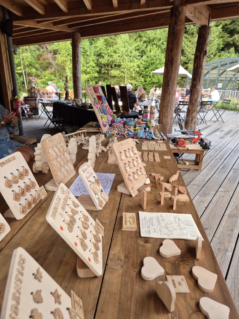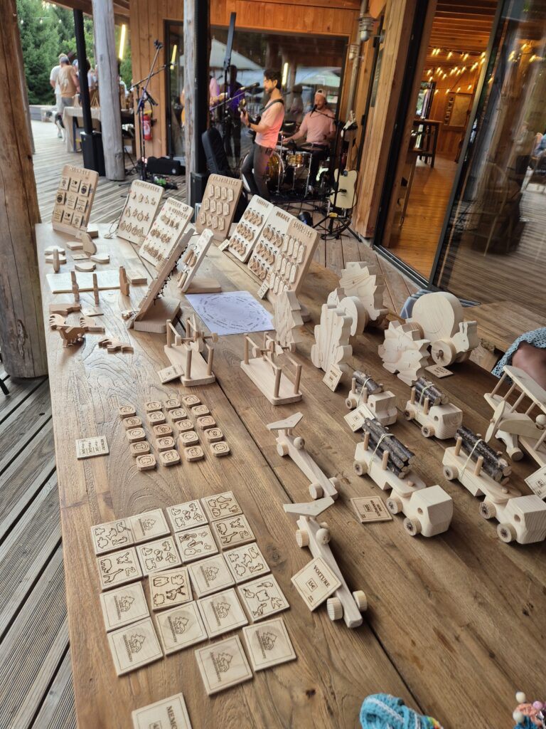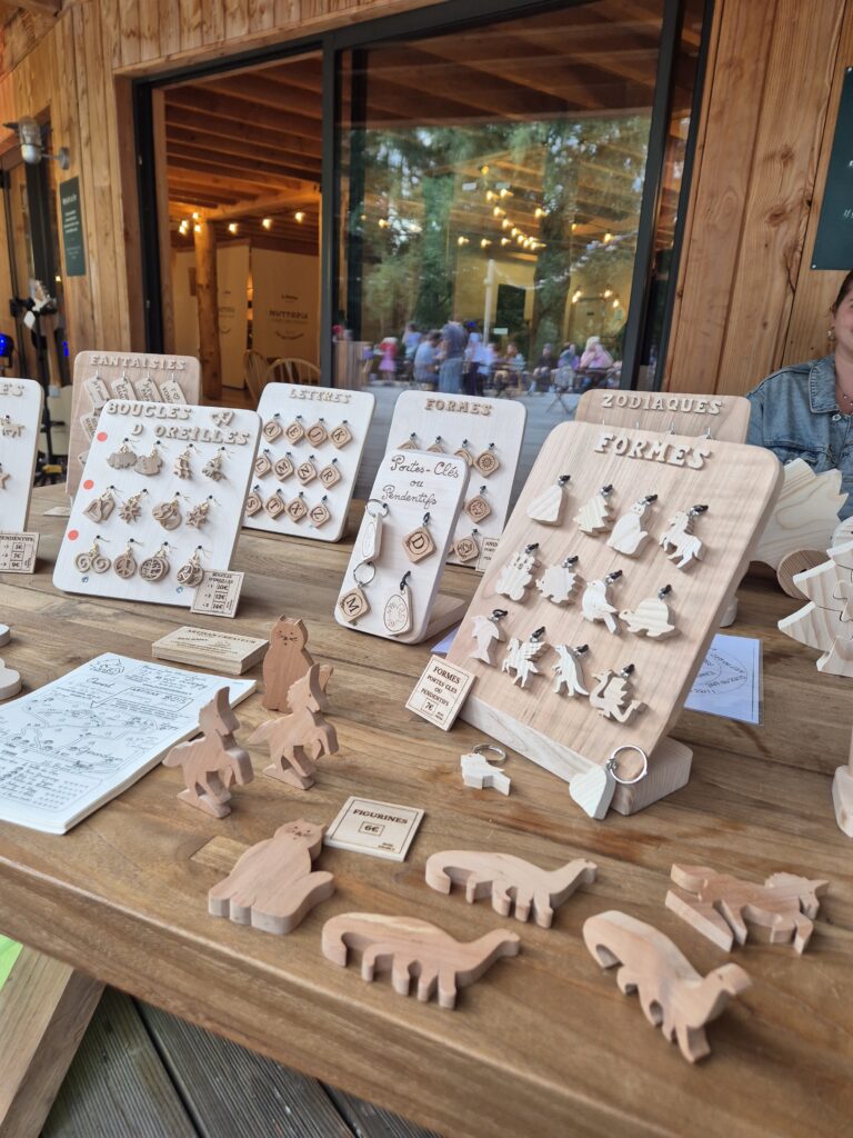 Une petite boutique mobile est installée sur place pour celles et ceux qui souhaitent repartir avec un jouet ou un objet en bois fabriqué par nos soins.